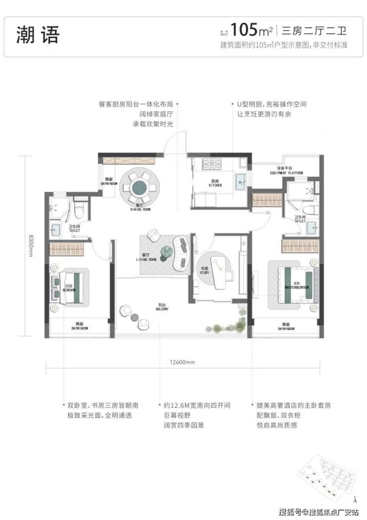 首先,项目的户型起步就是四开间朝南的建面约105方三房: