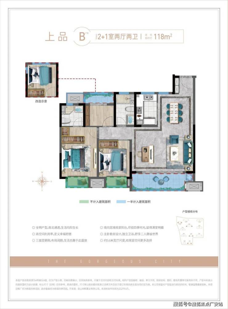 三开间朝南明朗格局,2+1灵动配置空间,成功避免“家庭早高峰”的双卫格局,搭配独立卫浴、衣帽间的主卧套房,让年轻一样可以奢享。