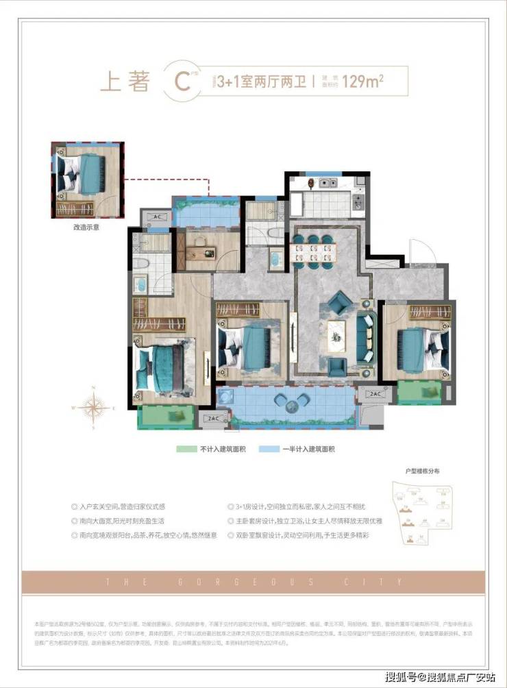 入户玄关彰显归家仪式感,3+1房配置体现非凡空间功能,“三代同堂,左右分居”的科学动线尊重家庭的独立私密,南向宽境双阳台开拓景观视野,处处均有亮点。