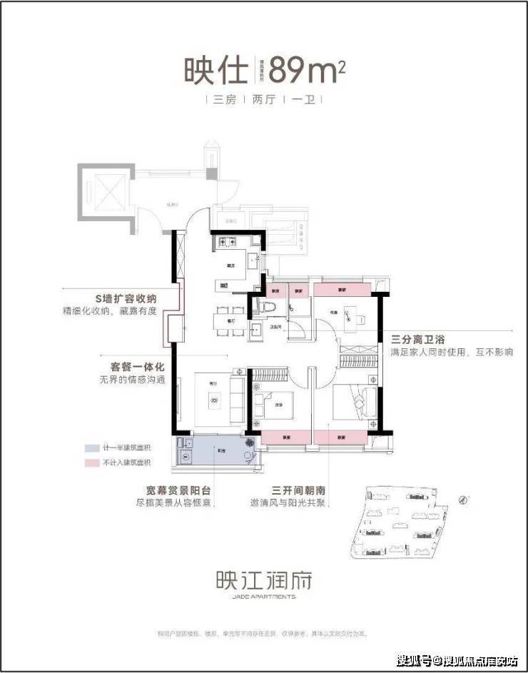 刚需房就要考虑三代人同住或者一家四口居住对房间数量的要求,这样考虑的话,房子最少应该是三居室,那89㎡的紧凑型小三房就更合适。
