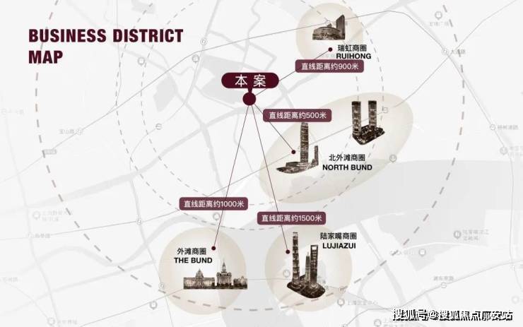 商业方面:项目约2公里内多元繁华构筑封面商业圈,北外滩商圈直线距离约500米;外滩商圈直线距离约1000米;陆家嘴商圈直线距离约1500米;瑞虹商圈直线距离约900米。