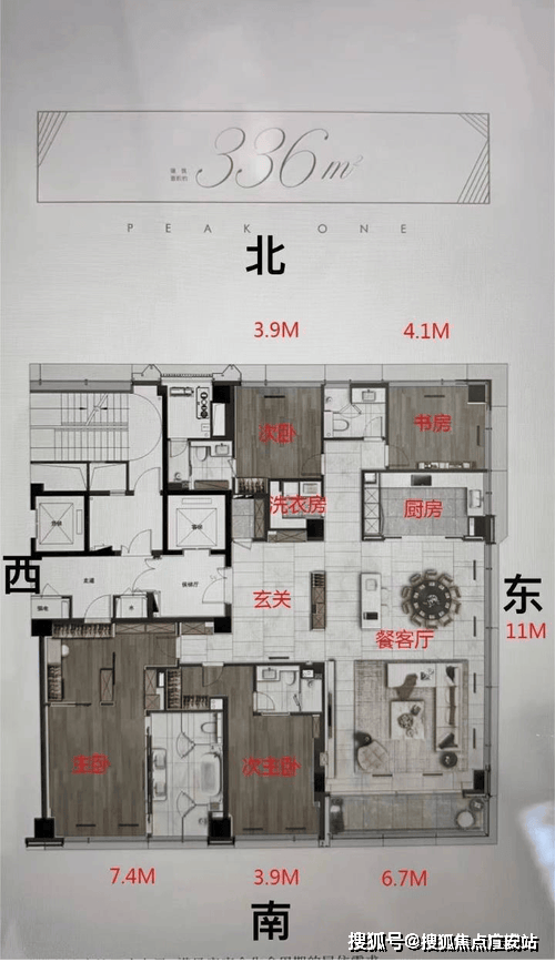 【户型面积】 :东边套336㎡四房、西边套340㎡三房,顶楼430㎡,户户带12平阳台