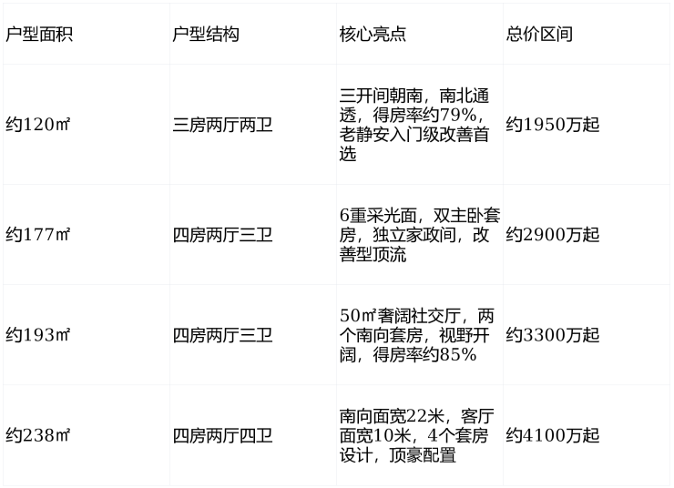主力户型:约120㎡三房、约177㎡四房、约193㎡四房、约238㎡四房,总价约1950万起、2900万起、3300万起、4100万起