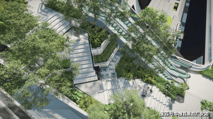 楼王东侧就是三大花园的其中之一,也是艺术感最强的一个花园,将结合艺术装置和台阶,为业主提供舒适闲坐、眺望树冠景观的空中露台。