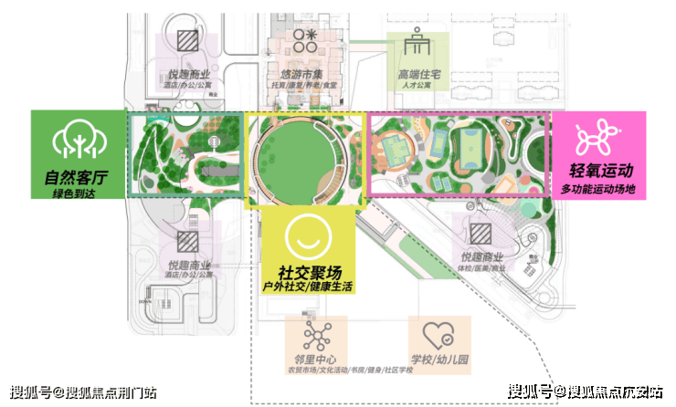 三大主题公园由澳大利亚Hassell国际设计事务所打造,总规划面积约5万㎡。其中西公园规划为自然客厅,中心花园是社交聚场,东公园则是轻氧运动(多功能运动场地)。