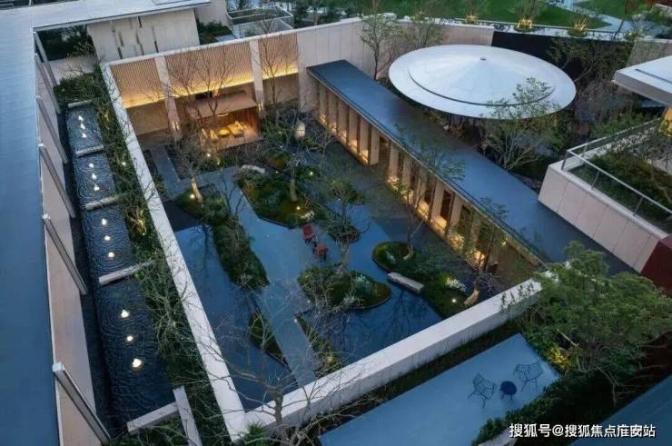 约6米高水幕的下沉式山水庭院,灵动的流水,层次丰富的空间,在自然松弛的氛围中,增添了一丝活泼的趣味。