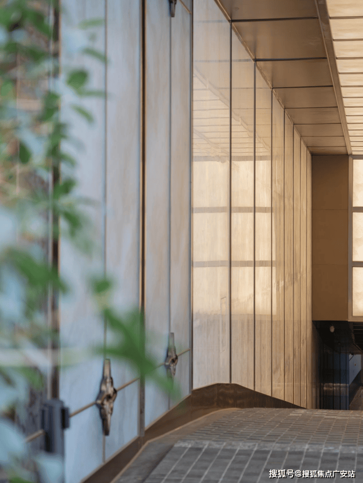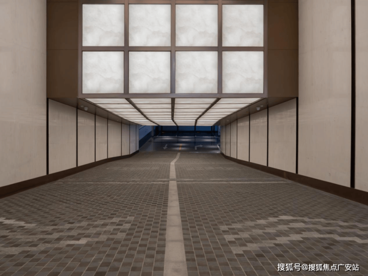 往里走,入口坡道的顶面,以纤细的金属线条勾勒出秩序的骨架,内嵌的透光云石玻璃,于细节处营造上海高端小区车库范本。