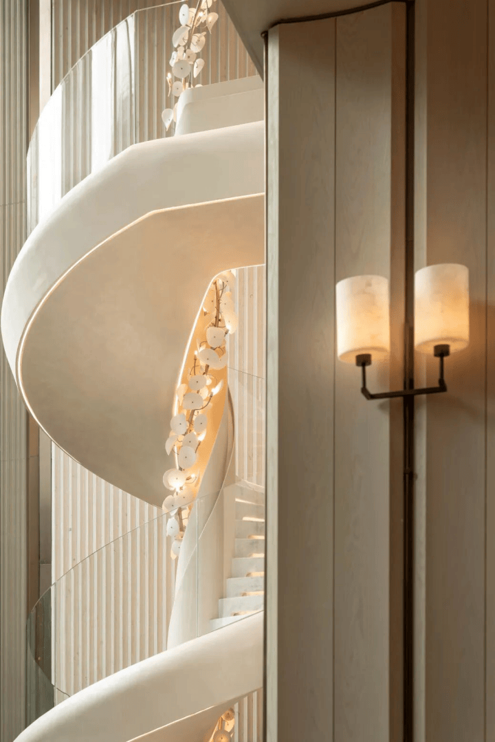 旋梯以流畅曲线漾开攀升的韵律,中心灯饰如藤蔓向上生长,与梯身相映成和。