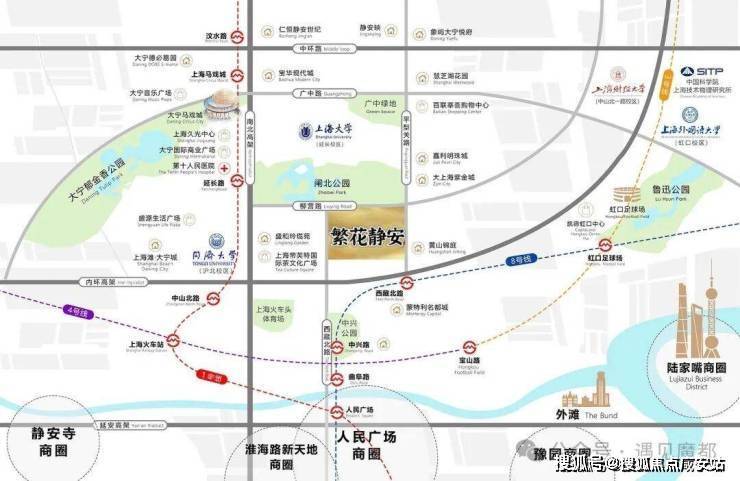 繁花静安位于静安区中部,地处 “南京西路 - 静安寺 - 苏河湾” 黄金三角腹地,向西紧邻静安寺商圈,向东衔接苏河湾滨水区,向北联动大宁国际商务区,向南靠近人民广场核心区。这一区域是静安 “十四五” 规划中重点打造的 “中央活动区”,也是上海主城功能最集中、资源最密集的板块之一。