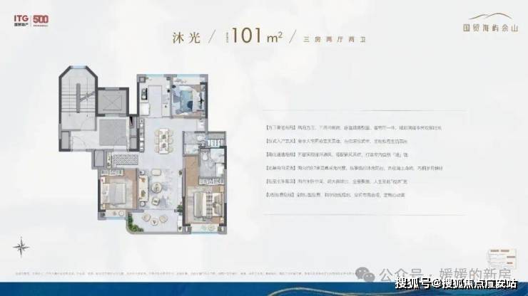 在户型规划上更是凭借小高层无连廊+飞机户型的设计优势,将室内的实际使用空间做到了最大.所以,虽然户型的建筑面积是约101㎡的3房,但整个空间的尺度感却能匹配改善型的宽绰3房.