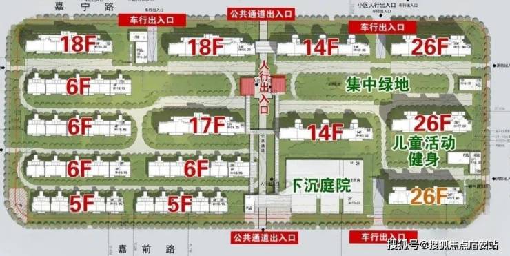 根据公示图显示,该项目的4个小板块最高层为项目东南角和西北角的26层高层,共有6栋,高度接近地块限高的80米(77.80米);18层的共有8栋;17层共有6栋;14层共有4栋;13层共有2栋;6层的共有4栋;5层的共有8栋。