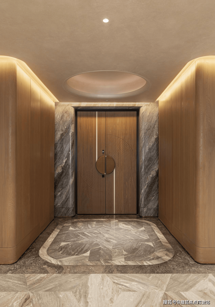从海派入户旋转门推门而入,第一眼便能看到约13-15米的挑高大堂,艺术阶梯其作为艺术展示的重要空间,最大程度引入自然光,为空间打上朦胧、柔和的光感,融合左右两边的弧形柱体,犹如登山之“径”,随着脚步一步步叠加行进的趣味,沉浸的归家体验感随空间变化逐渐递增。