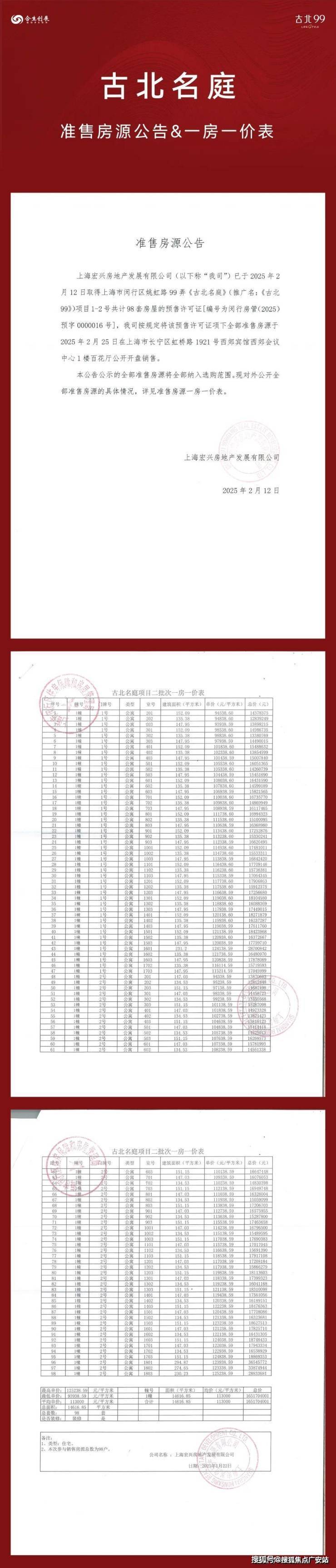 最新消息,古北99火爆认购啦!古北准现房!约133-154m²2-3房,单价94000/平!最新一房一价表!