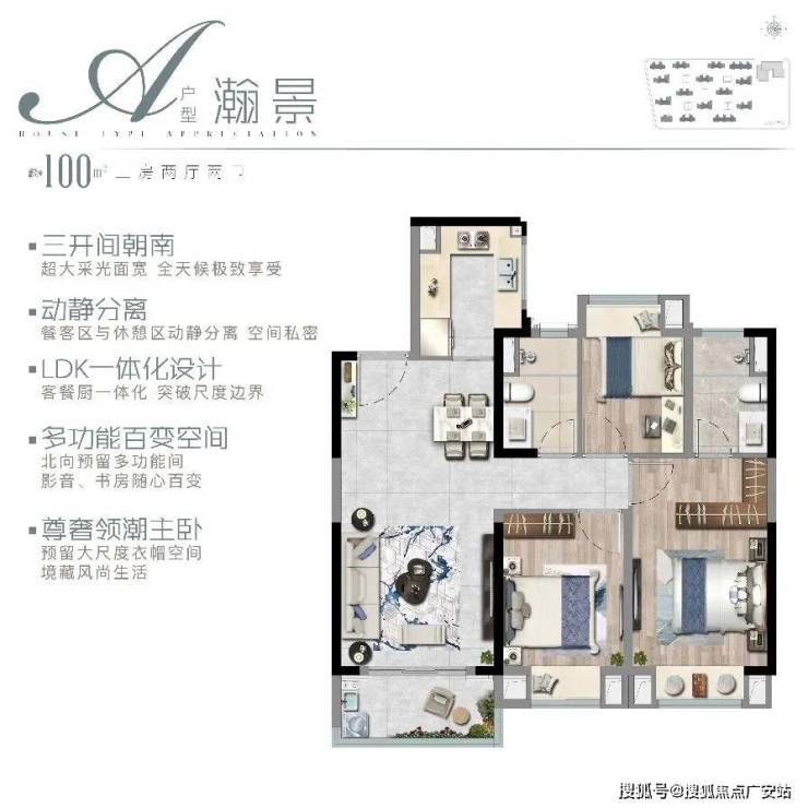 项目约100㎡3房2卫的户型把实用性做到了极致,总价虽低,但能满足业主从二人世界到二胎生活的全生命周期需求。