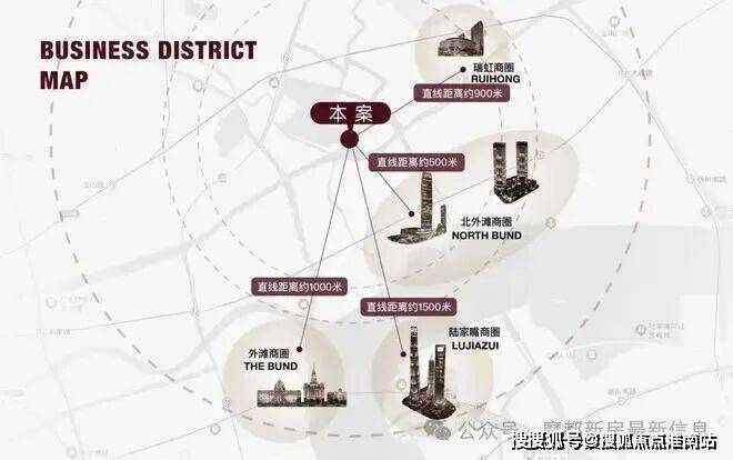 商业方面:项目约2公里内多元繁华构筑封面商业圈,北外滩商圈直线距离约500米;外滩商圈直线距离约1000米;陆家嘴商圈直线距离约1500米;瑞虹商圈直线距离约900米。