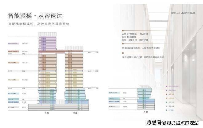电梯数量:A座27部客梯,1部VIP梯,B座18部客梯,C座3部客梯、1部VIP梯(通力)