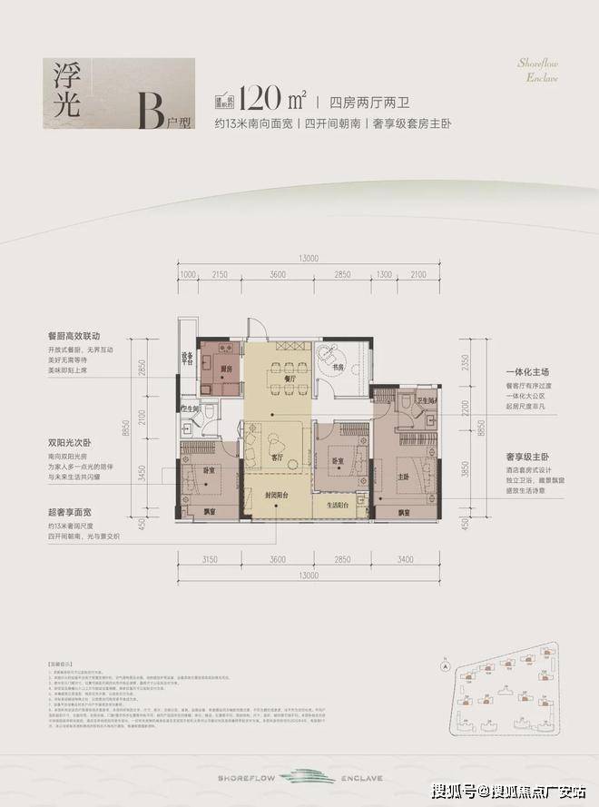 这款户型堪称四开间朝南的“流量王者”,南向面宽约13米,双联阳台+双飘窗设计,视野和采光优秀;套房主卧、双阳光次卧,颇有大平层的气势。