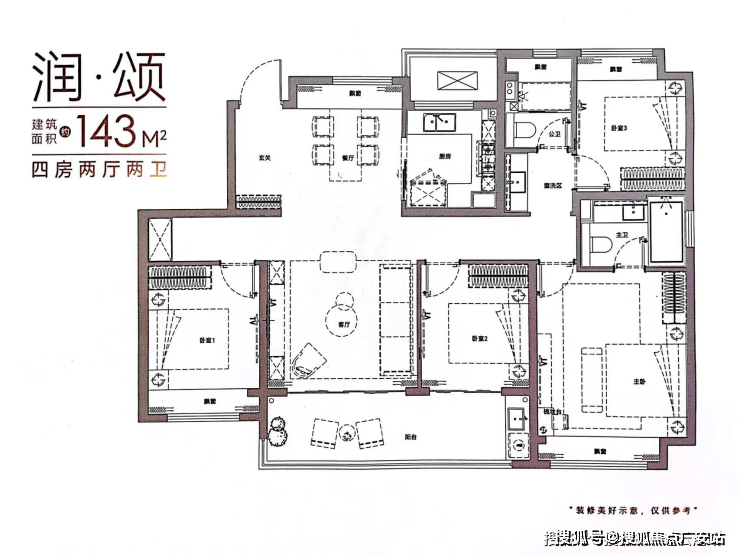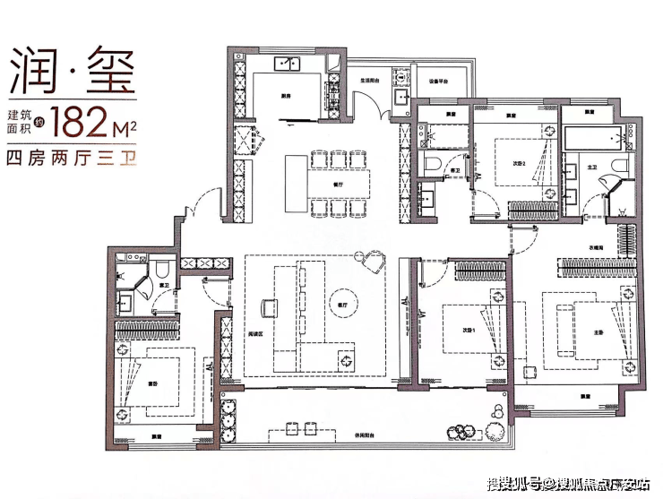 182㎡四居:4室2厅3卫+双主卧套房,配中西双厨设计,得房率82%