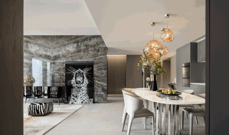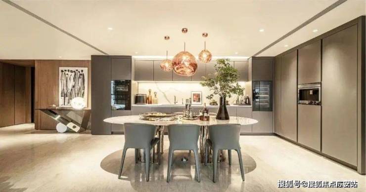 厨房,作为家庭生活中的重要场所,不仅是烹饪美食的舞台,更是家庭温馨与亲情的交汇点。在这套豪宅的设计中,厨房同样被赋予了独特的魅力和情感价值。为了避免厨房设计显得过于平庸,设计师还巧妙地加入了艺术元素。这些艺术元素与厨房的实用功能相结合,既提升了整体空间的美感,又让居住者在烹饪过程中能够享受到一种艺术与生活的交融。