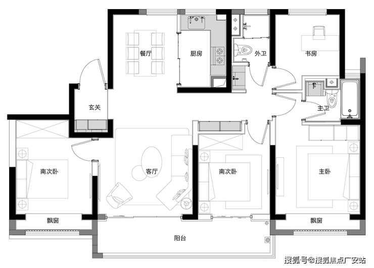 客餐厅南北朝向,宽敞明亮,室内外空气迅速交换。