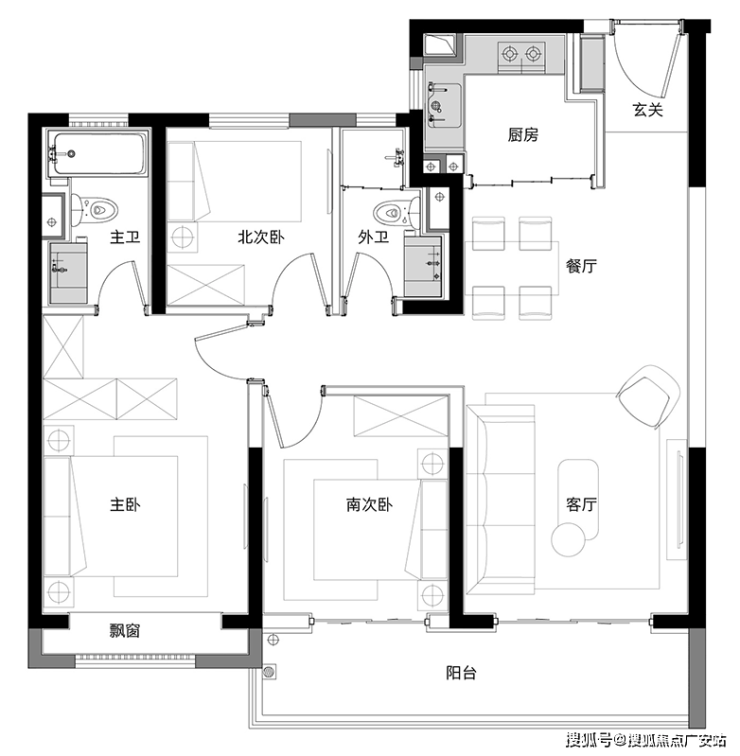 三房两卫设计,主卫设有浴缸,放松一天的疲劳。