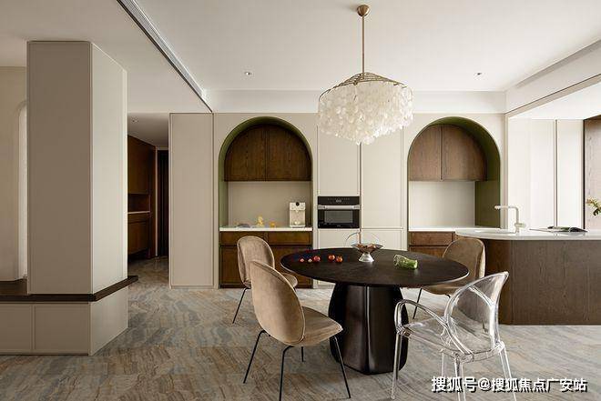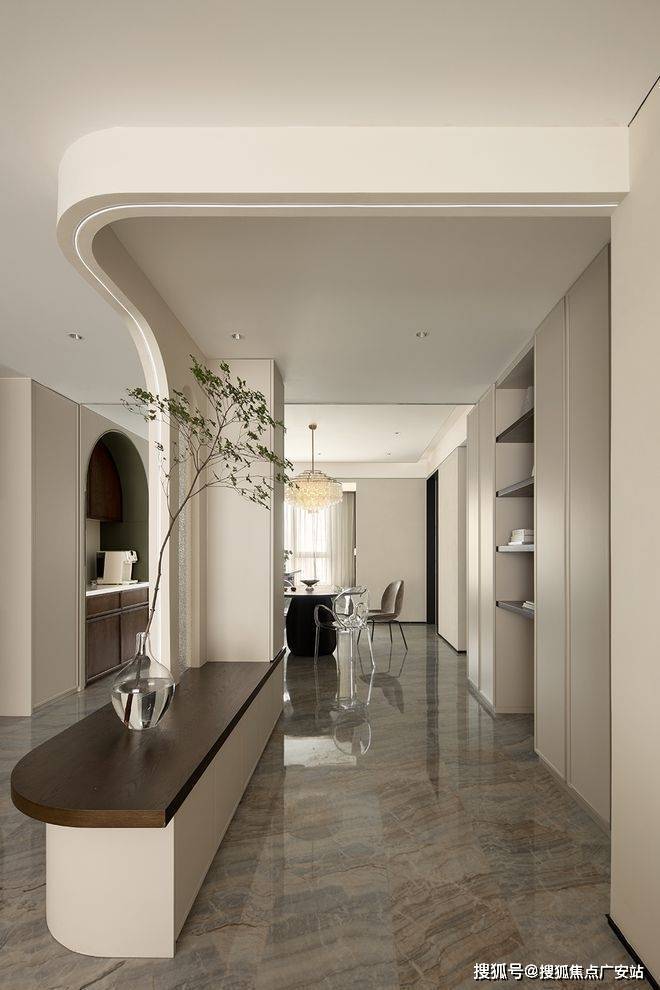 挑高扇形弧度造型、内置收纳玄关柜,与自然质感的材质虚实结合,绿植与灯光的适度渲染。