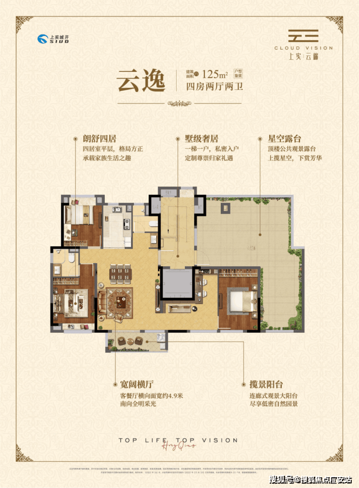 约125㎡四房两厅两卫,一梯一户设计,专属入户空间。