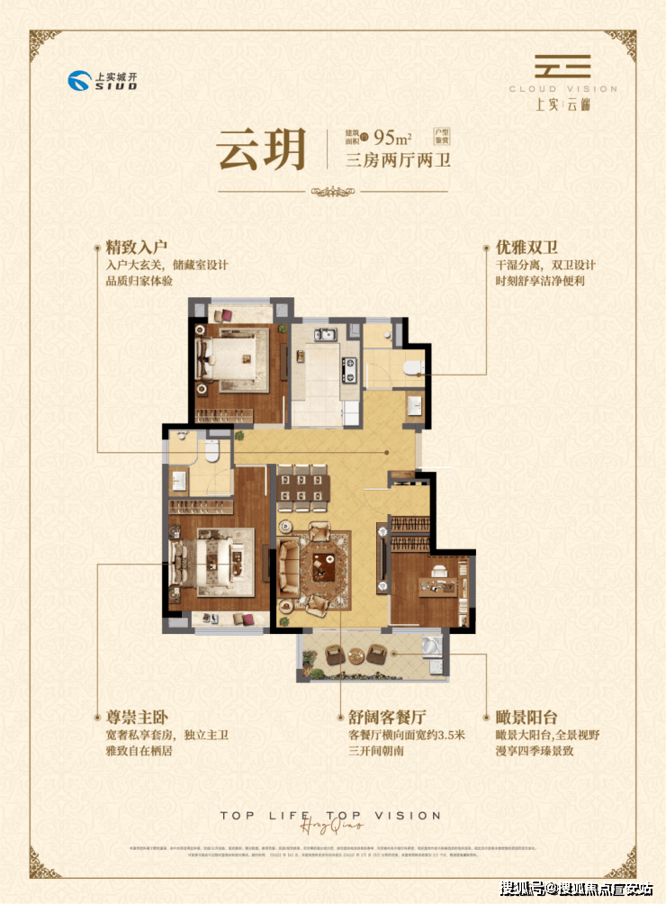 约95㎡三房两厅两卫,做到了三开间朝南+瞰景大阳台+主卧套房设计+南北通透+卫生间干湿分离,该户型得房率和空间利用率都非常高。