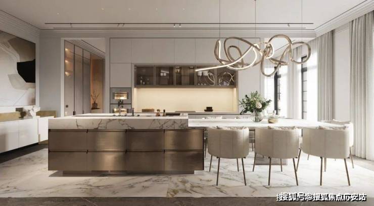 在厨房的设计中依然沿袭客厅的设计采用大理石元素,通过金属元素与大理石元素的结合来表现空间的轻奢,其中金属的岛台加上大理石台面让空间极具氛围感,让空间看上去更有层次。