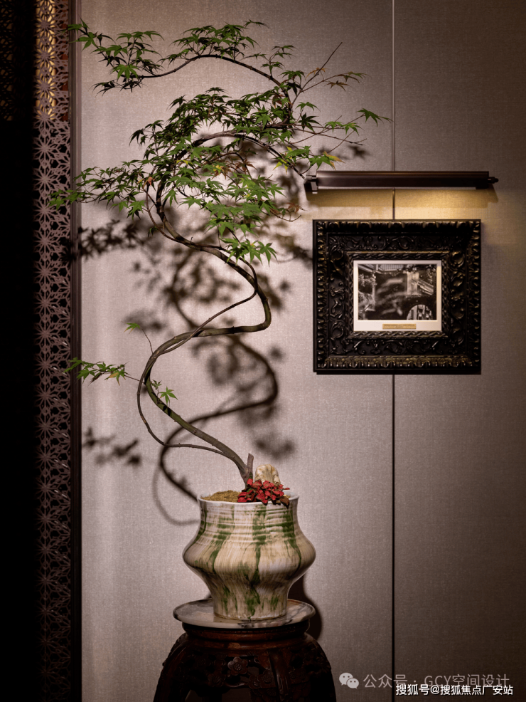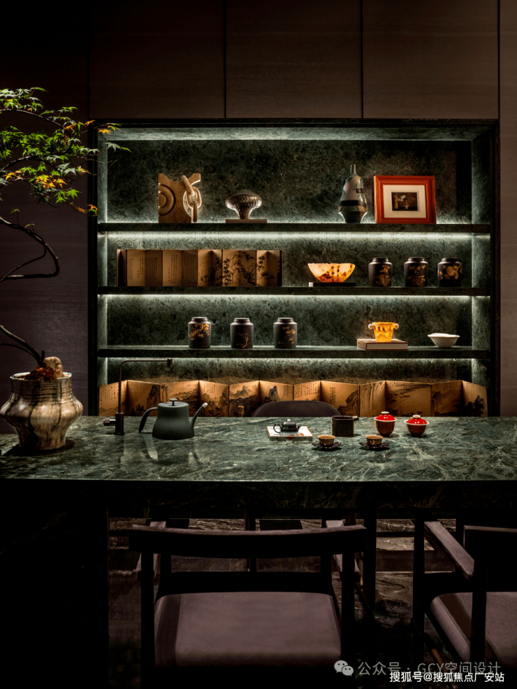 拙朴的陶器陈设置于纹理精致的理石方柱上,强化了空间中亦古亦今,既奢华又雅致的艺术氛围与文化内涵。
