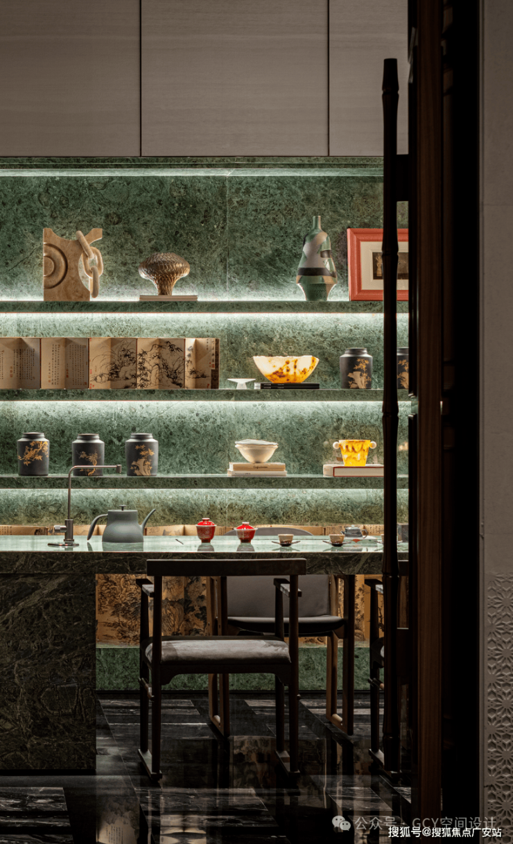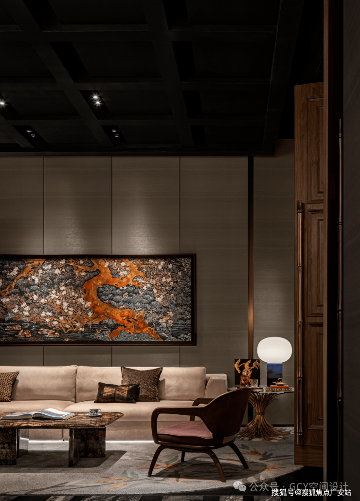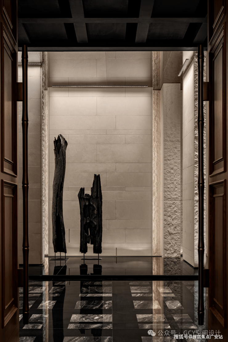 整体风格奢华典雅,通过材质、灯光与艺术陈设的结合,营造出极具格调的视觉体验。