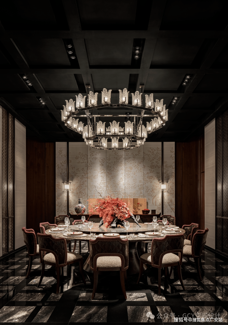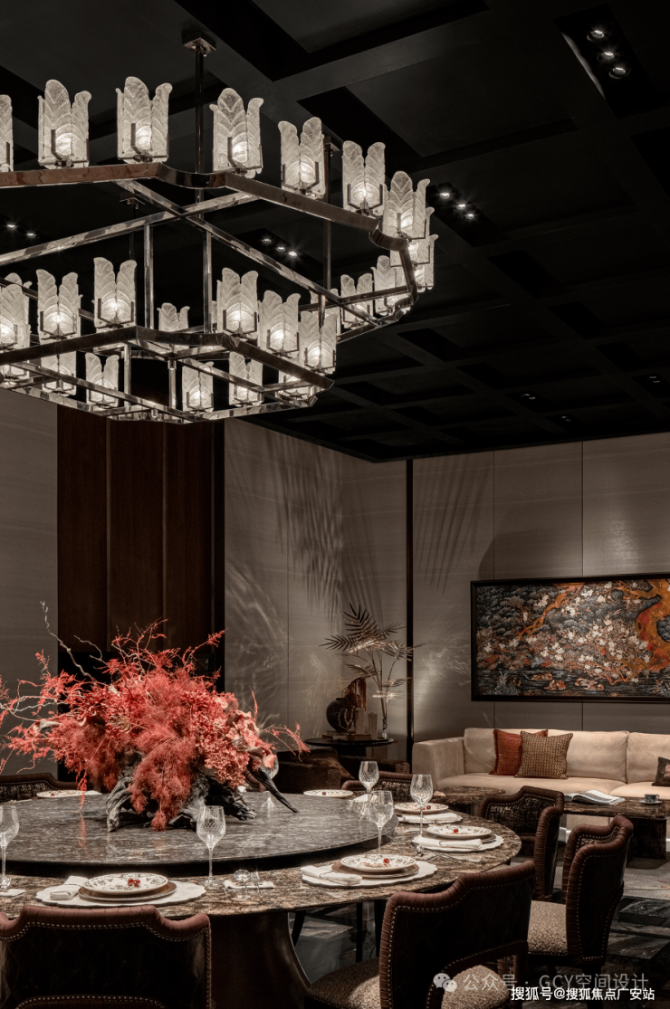 低彩度的大理石的圆形餐桌,搭配精致的餐具与高脚杯,布局规整,适合多人用餐或社交活动,彰显品质感。多层艺术吊灯由多个玻璃灯罩组成,灯光柔和且富有层次,成为空间的视觉核心,同时营造出优雅的用餐氛围。红色系艺术花艺造型夸张且富有设计感,为空间注入活力。