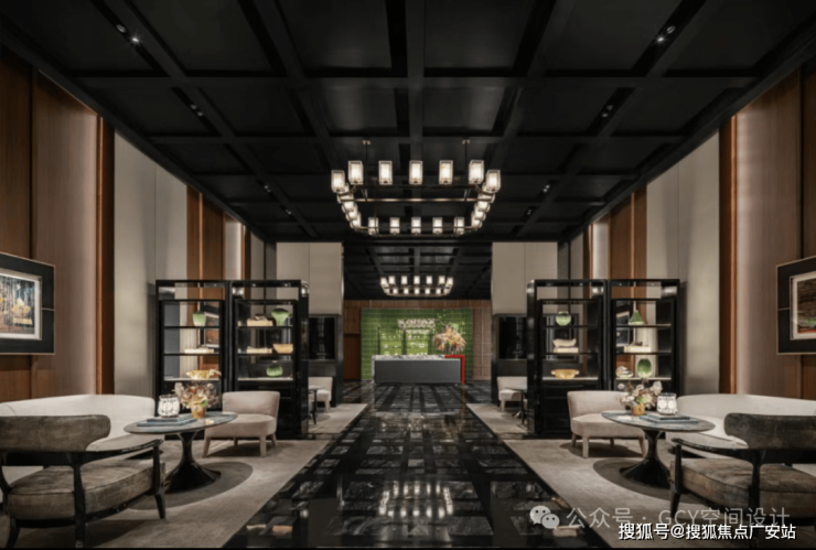 大理石拼花地面光泽感强,反射出灯具与陈设的影像,提升了空间的奢华质感。黑色的置物架作为空间隔断,既使各个洽谈区相互独立,又能通过元素的统一而相互呼应。