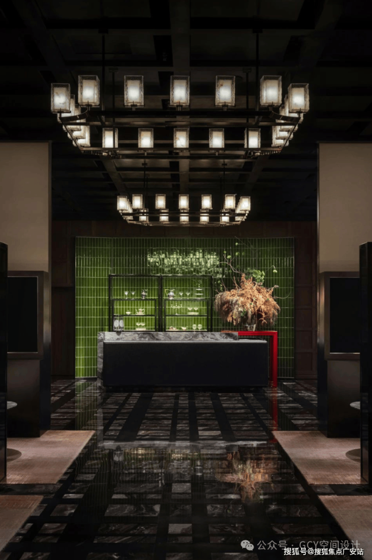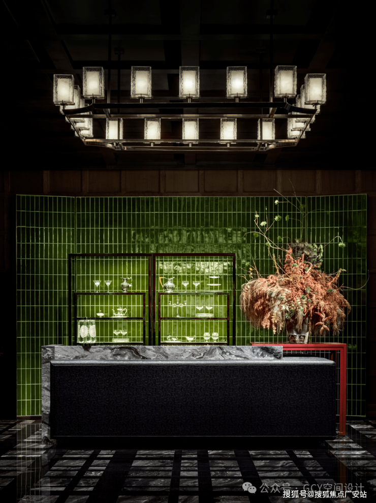 天花板为黑色格栅造型,搭配线性灯具与嵌入式灯光,营造出层次丰富的光影效果,兼具现代感与艺术感。绿色网格状瓷砖墙面,色彩鲜明且富有现代感,为空间奠定了独特的视觉基调。