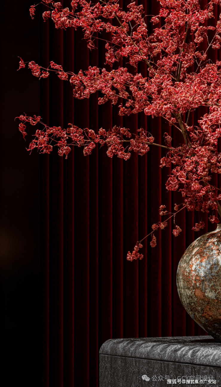 红色幕布前的蓝白波点艺术摆件置于古朴的基座上,形成古今、色彩的强烈对比,增添了空间的艺术氛围与文化内涵。
