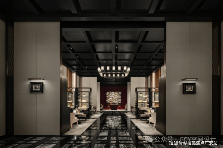 大理石拼花地面,纹理细腻且光泽感强,提升了空间的奢华质感。顶部悬挂的多层方形玻璃灯具,纹理精致且透光性好,灯光柔和,形成了富有层次的视觉焦点,兼具照明与艺术装饰功能。两侧墙面的嵌入式灯光装置,与主灯具呼应,增强了空间的纵深感与氛围感。走廊尽头的红色台面搭配艺术花艺,成为视觉终点,起到了空间引导与氛围营造的作用。