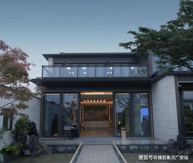 新中式风格,浅灰石材+咖啡色铝板立面,悬山顶设计融合传统宋韵美学