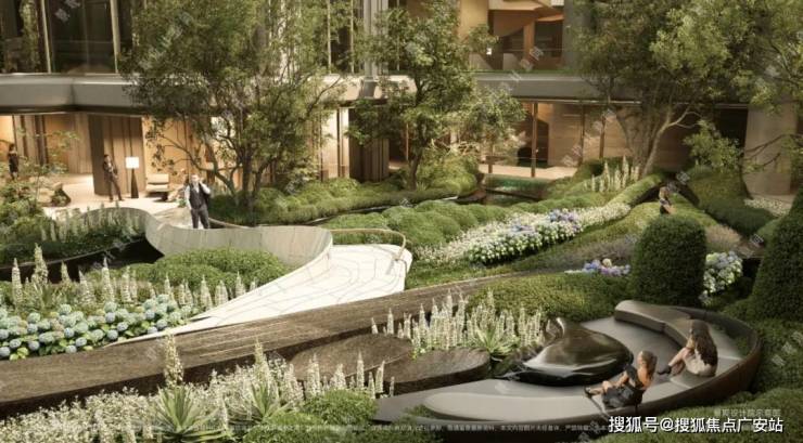项目拥有罕见立体景观“城市山林”社区,在全域抬板约4米的基础上,项目又下挖,形成罕见垂直落差。依托这一独特地形,项目打造“沿街古树花园+板上浮空花园+板下流石花园”的多层立体景观体系。