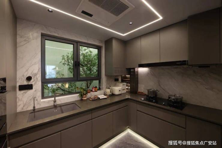 项目的 厨房部分巧妙的利用了 飘窗台做水槽的设计,一方面这提升了 厨房实际使用空间,能将6件套家电塞下,同时保证橱柜配置满足功能。另外一方面这也让 视觉空间上显得更大,更阔绰。