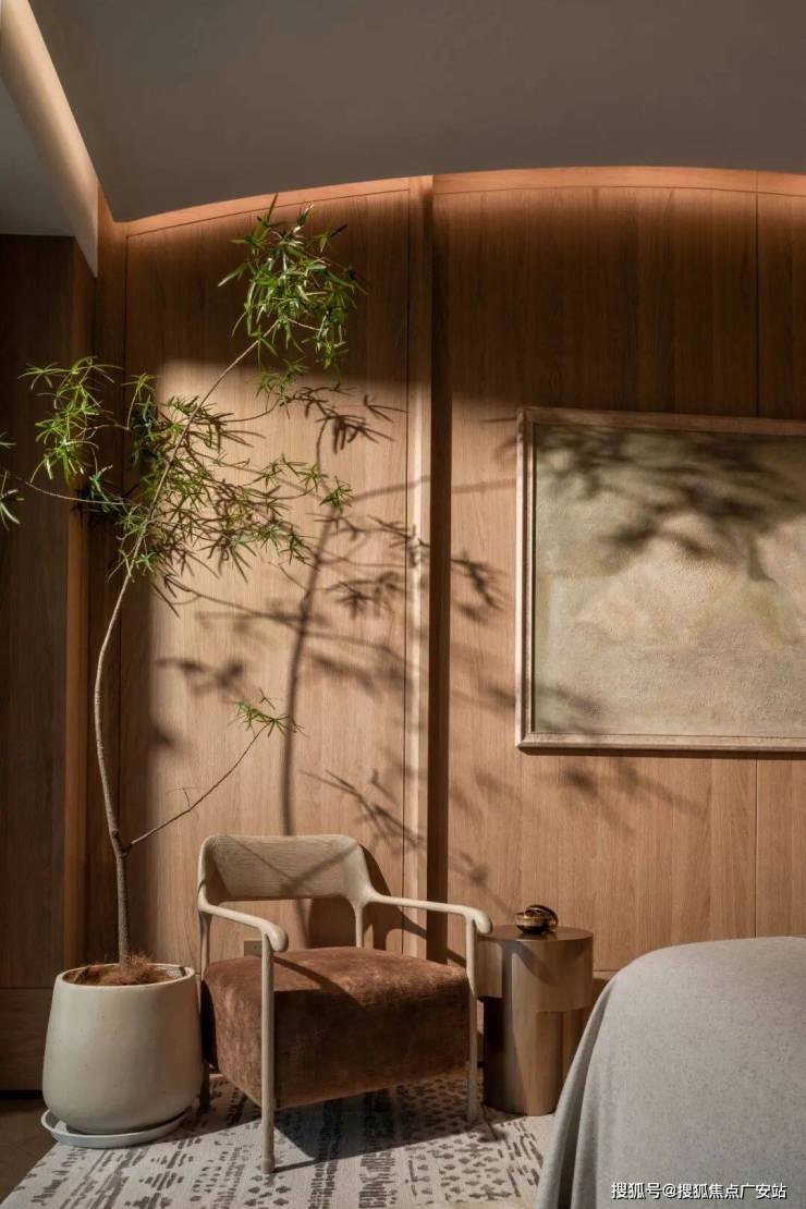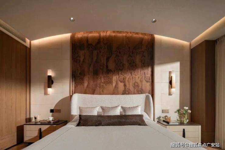 主卧墙面以小块羊皮纸拼贴两端 ,中心树瘤木饰面流露出自然的气息,用年轮记载着岁月的深远。