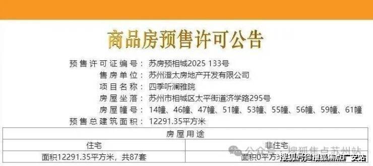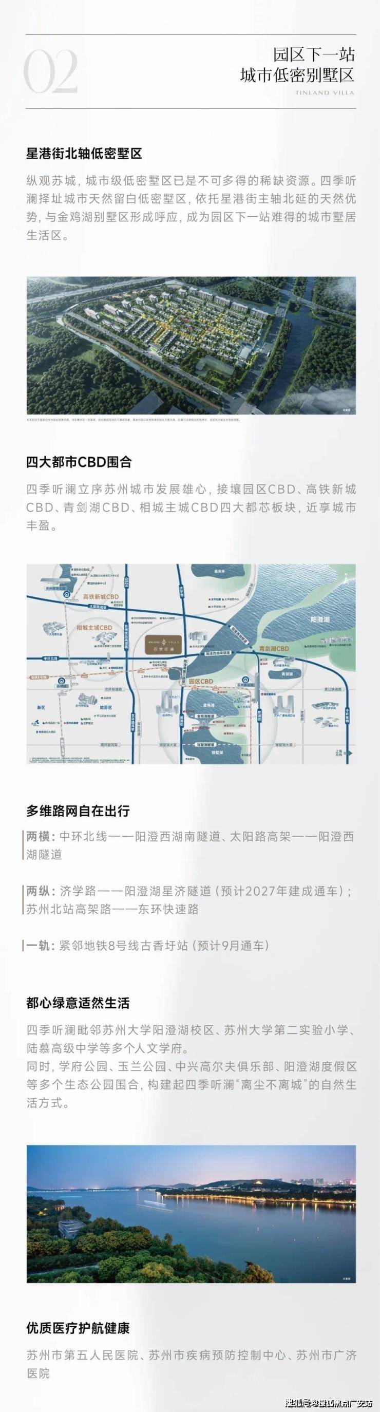 参数详情项目名称四季听澜(备案名:华发太平项目,苏地2023-WG-85号地块)开发商苏州太平城乡一体化建设发展有限公司(太平国投)、太仓中惠房地产开发有限公司(华发股份)联合开发位置苏州市相城区太平街道章港河北、济学路西(苏州大学阳澄湖校区对面)产权年限70年住宅产权(住宅/别墅均为70年)规划占地约8.53万方,总建面约14.9万方,66栋低密住宅(6栋3层合院、35栋3层联排、13栋4层叠加、12栋7层洋房),总户数593户,车位比1:1.8容积率1.05(苏州主城罕见超低容积率,纯正墅居体验)绿化率30%开盘/在售2025年9月23日首开,2025年11月7日加推,持续在售交付时间预计2027年3月31日物业费2.95元/㎡/月(华发物业服务)交付标准7层洋房精装交付,合院/联排/叠加毛坯交付核心特色1.05超低容积率、双国企开发、近园区低密墅区、苏大阳澄湖校区旁、四大CBD环绕、全业态覆盖