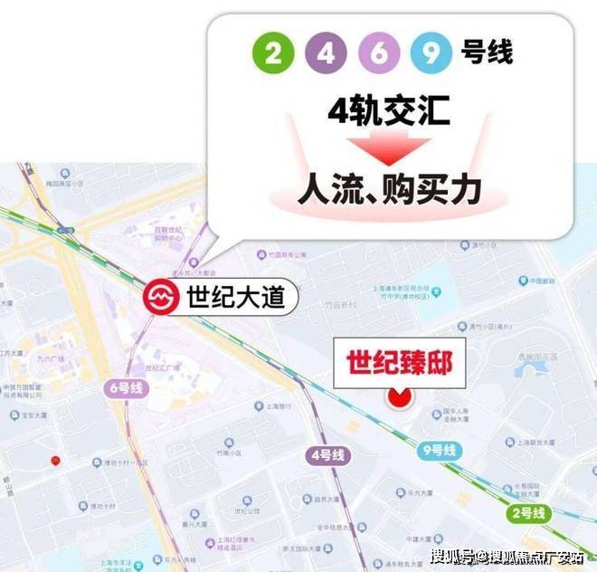 从世纪臻邸出发,往西南约500米,就是4轨交的世纪大道。