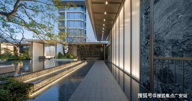 穿过归家大堂,入眼的便是大片的镜面摩登水院,涌泉叠水,高低错落、动静相宜。景观设计团队更是在水院里做了一个下沉式卡座,未来业主可以在这里闲坐观景,与三五好友可以畅聊天地。