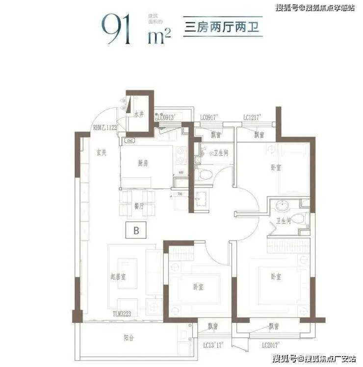 建面约91㎡ 3房2厅2卫▼