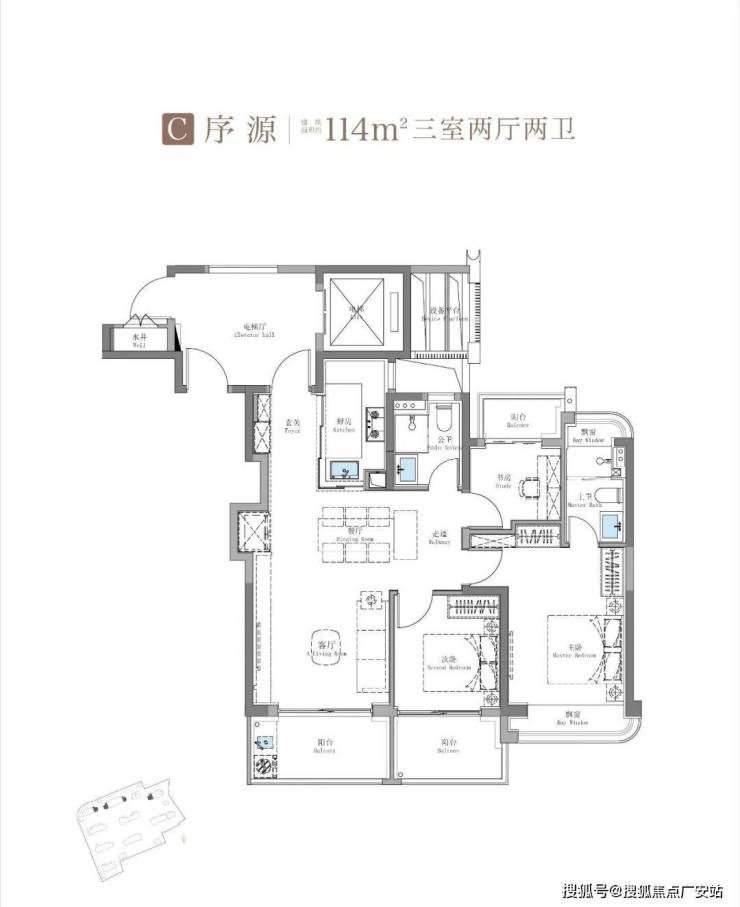 是的,三阳台的设计手法,仿佛一个膨胀剂,将建筑面积114平米的户型,产生了全方位的扩容。