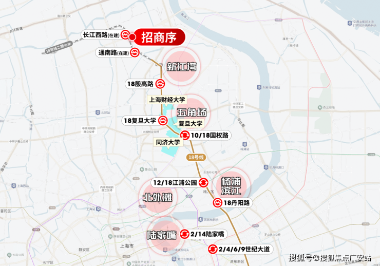 从长江西路出发(在建)出发,2站就是新江湾,4站财大,5站复旦,6站五角场,8站新华医院,11站杨浦滨江,12站陆家嘴滨江...