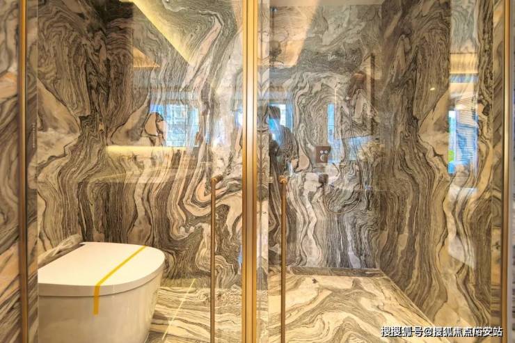 最让人意外的是主卫浴室墙面采用了江水般纹理的石材,非常个性且夸张,这完全不是常规豪宅的做法,年轻艺术潮人却会非常心动。