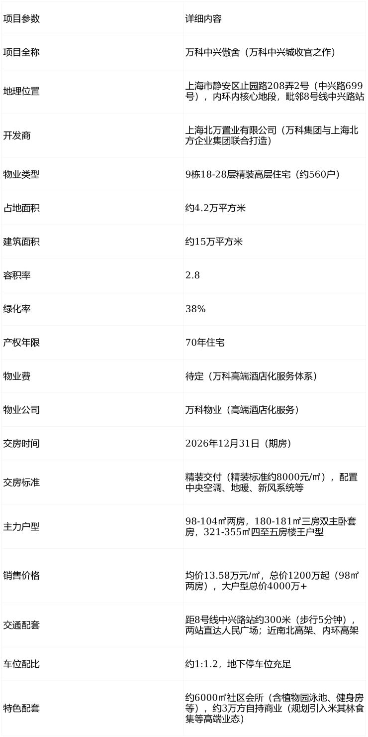 万科中兴傲舍作为万科在静安内环的收官之作,以内环稀缺地段、地铁上盖优势、高端产品设计和顶级配套资源为核心竞争力,适合追求内环核心生活圈与高品质居住体验的高净值改善型家庭。然而,价格门槛较高、期房交付、部分楼栋可能受噪音影响以及社区密度相对较高等问题也需要潜在购房者综合考量。对于预算充足、注重交通便利性与品牌品质的买家来说,该项目仍是静安区难得的优质新房选择,尤其适合"千万级门槛入内环"的购房者把握最后机会。