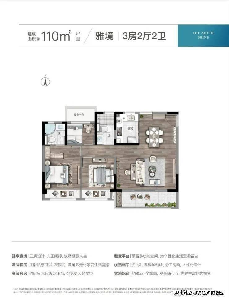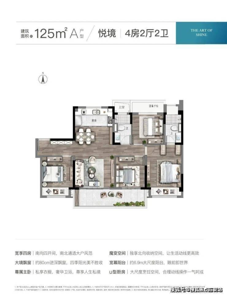 大境悦府打造18栋17-18层精装,首开5#、6#、9#、11#楼,共计约288套房,首开100和110㎡户型,125㎡后期待开。项目全装修交付,有新风+中央空调+智能家居,装标拿地规定不低于1500元/㎡。