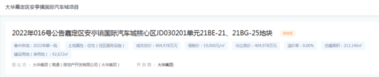 2022年6月1日,大华以40.4978亿元竞得嘉定区安亭镇国际汽车城核心区JD030201单元21BE-21、21BG-25地块【即大华梧桐樾】,成交楼板价1.9万元/㎡,地块房地联动价4.2万元/㎡。就在昔日红盘万科西郊都会的隔壁!